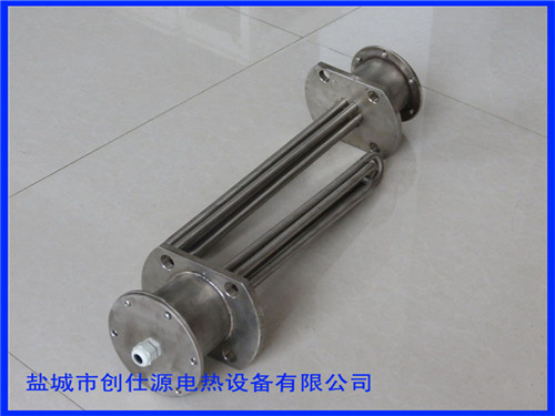 法蘭式不銹鋼加熱管(也稱插入式電加熱器):是采用U型管狀電熱元件,依據(jù)加熱不同介質(zhì)設(shè)計(jì)規(guī)范,按照功率配置要求裝配在法蘭蓋上,插入需加熱物料中,發(fā)熱元件工作時(shí)所發(fā)出的大量熱量傳導(dǎo)給被加熱介質(zhì)使介質(zhì)溫度升高,達(dá)到所需的工藝要求。當(dāng)介質(zhì)溫度達(dá)到工藝要求的設(shè)定值時(shí),控制系統(tǒng)根據(jù)溫度傳感器信號(hào),經(jīng)PID運(yùn)算后調(diào)節(jié)電加熱器輸出功率,對(duì)發(fā)熱元件的電阻性負(fù)載實(shí)現(xiàn)溫度控制。使介質(zhì)溫度均勻,達(dá)到所需要求;當(dāng)發(fā)熱元件超溫或低液位時(shí),發(fā)熱元件的聯(lián)鎖保護(hù)裝置立即切斷加熱電源避免發(fā)熱元件燒壞,延長(zhǎng)使用壽命。